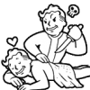 Description: an icon from the video game fallout: new vegas, in which two cartoon men lie together. one is lying comfortably under a towel, eyes closed, whilst the other smiles deviously behind his back, readying a knife to strike.